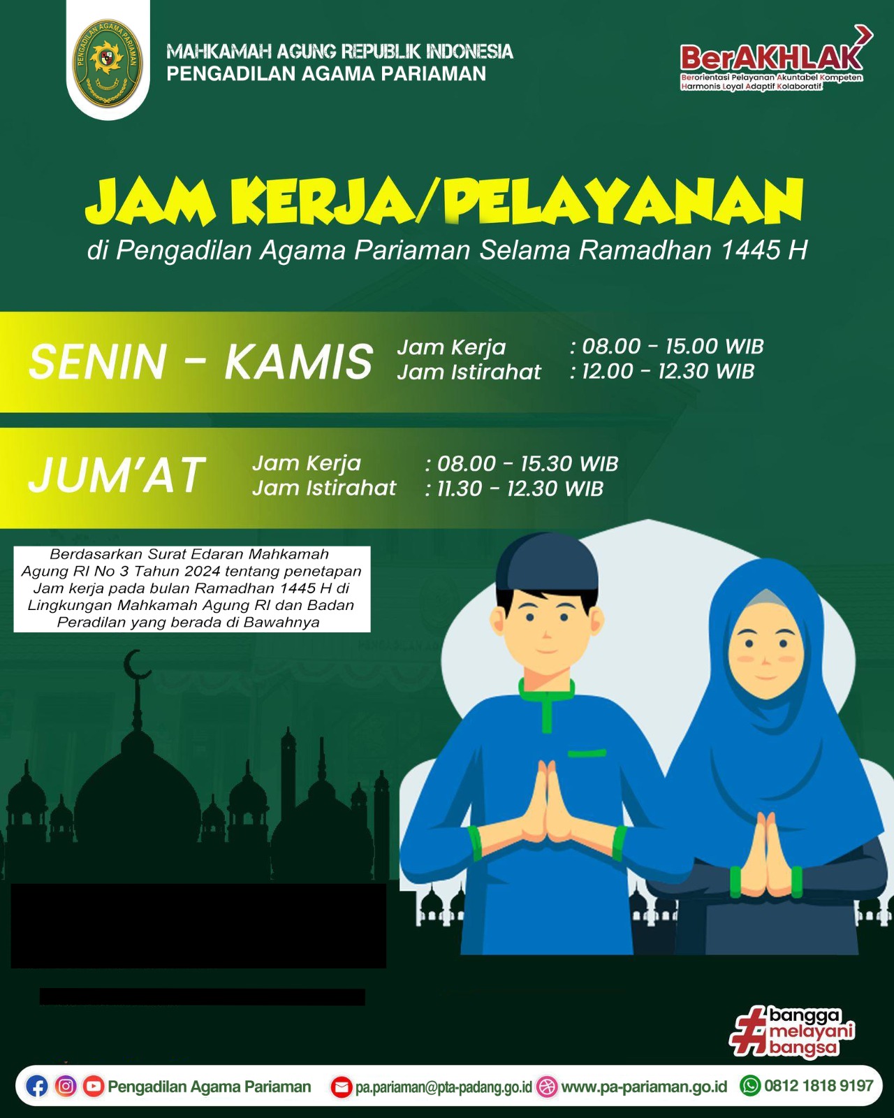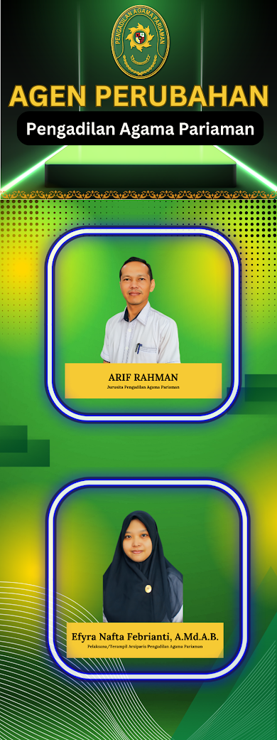 Hati-hati terhadap tindakan penipuan yang mengatas-namakan Mahkamah Agung Republik Indonesia pada umumnya maupun Pengadilan Agama Pariaman pada khususnya. Laporkan segala tindak penipuan ke https://siwas.mahkamahagung.go.id atau laporan anda dapat juga melalui SMS Center Pengadilan Agama Pariaman